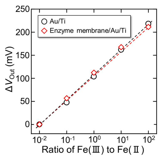 To confirm that the enzyme-immobilized sensor functions as a redox sensor, the potential change in the redox response was measured and compared to that of the sensor without an enzyme membrane. Figure 5 shows the relationship between the output voltage change (ΔVOut) of the sensor and the concentration ratio of Fe (III) to Fe (II). The ΔVOut for the enzyme-immobilized sensor changed linearly with increasing the Fe (III) concentration to Fe (II) and showed an almost equivalent response to that of the bare electrode. The sensitivity of the enzyme-immobilized sensor was 53.4 mV/decade, whereas the sensitivity of the bare electrode was 55.1 mV/decade, and the difference among samples was 1.7 mV/decade. Because the variation in the sensitivity between these samples occurred at approximately 3 mV/decade, the decreasing sensitivity of the enzyme-immobilized membrane may be negligible. Therefore, it was confirmed that the fabricated sensor functions as a redox sensor with a suitable sensitivity to detect the redox response even when the membrane is formed.