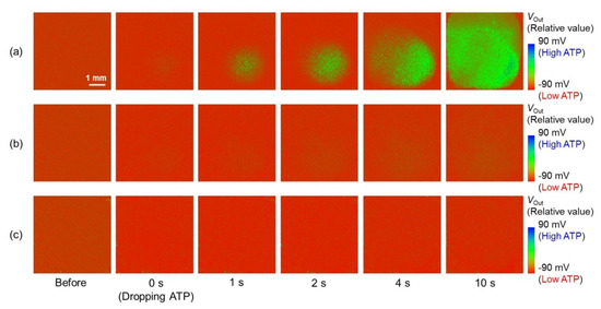 Figure 6 shows the output image change when the ATP solution was added to the buffer solution filled on the sensor. The output voltage (VOut) of the sensor array is expressed as relative values over a range of 90 mV, as shown by the color scale. As shown in Figure 6a, the output image of the enzyme-immobilized sensor clearly changed after the addition of ATP, and the VOut in the sensor array increased gradually (color change from red to green). On the other hand, the output image of the enzyme-free sensor hardly changed over the entire sensing region. Additionally, the output image change for the enzyme-immobilized sensor was not observed in the no-glycerol condition; it was observed only in the presence of enzymes and glycerol. Next, the temporal change in VOut change (ΔVOut) in the sensor array of each output image shown in Figure 4 was analyzed.