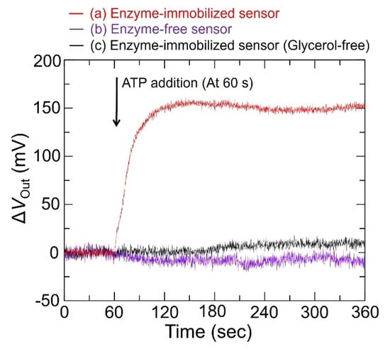 Characteristics investigation of output response after 1 mM–ATP was added to the sensor. (a) Typical ΔVOut–time curve to ATP measured by the enzyme–immobilized sensor, (b) time response of an enzyme−free sensor, and (c) time response of enzyme−immobilized sensor measured in no glycerol. Working buffer is 10 mM−HEPES at pH 7.4.