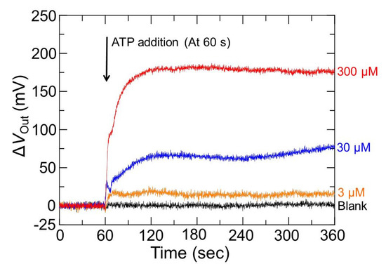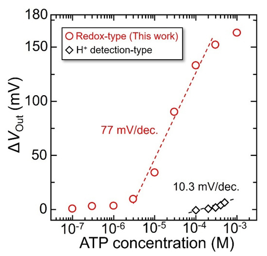 where Eo is the standard electrode potential, R is the universal gas constant, T is the absolute temperature, n is the number of electrons, and F is the Faraday constant. Therefore, the sensor output VOut is shown in Equation (5), and it changes depending on the concentration of ATP in an aqueous solution.