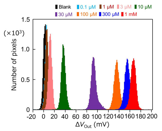 where VOut, at 360 s is the output response at 360 s measured by each pixel of the sensor array after the addition of ATP, and VOut, initial (at 50 s) is the initial value in each pixel before ATP addition. As shown in Figure 9, the output distribution of the enzyme-immobilized sensor with various concentrations of ATP showed a Gaussian distribution, and its peak shift was confirmed.