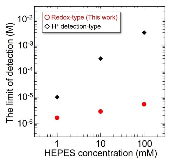In order to evaluate the influence of pH buffering action such as in the biological experiment, ATP measurement was conducted by controlling the concentration of HEPES with pH buffering action, and the LOD for the redox-type ATP image sensor was compared to that of the imaging device with the conventional H+ detection method, as described in Section 3.2.