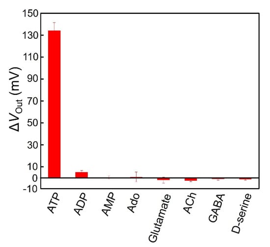 To examine the selectivity of the redox-type ATP image sensor with the enzyme-immobilized membrane for ATP, some analogous molecules such as ADP, AMP, and adenosine (Ado), and representative chemical molecules in the brain, such as glutamate, acetylcholine (ACh), γ-aminobutyric acid (GABA), and D-serine, were investigated. As shown in Figure 12, when ATP, ADP, AMP, Ado, glutamate, ACh, GABA, and D-serine were added to the sensor array, only the addition of ATP produced an obvious sensor response, suggesting high selectivity for ATP. Because of the high specificity of GK for glycerol and because its enzyme reaction is promoted in the presence of ATP, H2O2 cannot be produced in the case of other chemical molecules, indicating the high selectivity of our novel ATP imaging device based on the H2O2 detection technique for ATP. Additionally, because the actual extracellular concentration levels in the brain are expected to be several tens of µM or less, the proposed redox-type ATP image sensor allows for the accurate determination of ATP.