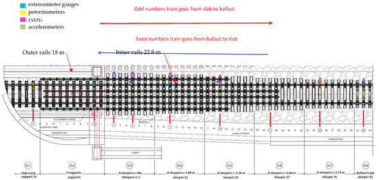 Figure 5 shows the sensor position during field measurements in the Dinatrans solution. In order to compare the performance between both tracks’ transitions, the instrumentation in the standard solution was placed in the same location (symmetrically when looking from the slab to the blast area). Both track transitions were divided into eight sections. Two first sections were slab track in the tunnel structure (BP-14 type) and the remaining 6 sections were in the ballast track (at both sides of the tunnel), as shown in Figure 5. Figure 5 was an open ballast track. The sleepers and supports were numbered from the limit between slab track and ballast track to both sides. The slab-track side had thirteen sleepers (from 1 to 13) and the ballast side (in ballast track) had forty-three sleepers (from 1 to 43) (Figure 5). The position of the devices along the track transitions was chosen to assess the overall performance of the track transitions during the passing of trains. Devices were placed on the slab-track, the ballast track, at the end of both track transitions, and some sections in the track. The measurement points and devices are summarized in Table 4. For example, section 4 in the ballasted track had one monitored sleeper (number 11) and section seven in the ballasted track had one monitored sleeper (sleeper 35).