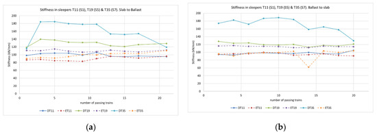 Stiffness in sleepers 11, 19 and 35. Train goes from slab to ballast (a). Train goes from ballast to slab (b).