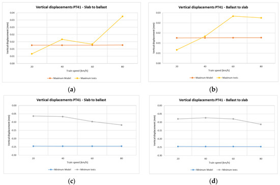 In the case of vertical rail displacements, the minimum value recorded for each train pass determines the highest vertical deflection of the rail with respect to the sleeper. Note that during the higher speed passes, the displacements at point PV11(1) (section S1, sleeper number 11) were around 80 km/h, making these movements less regular than in those found for the lower speed passes.