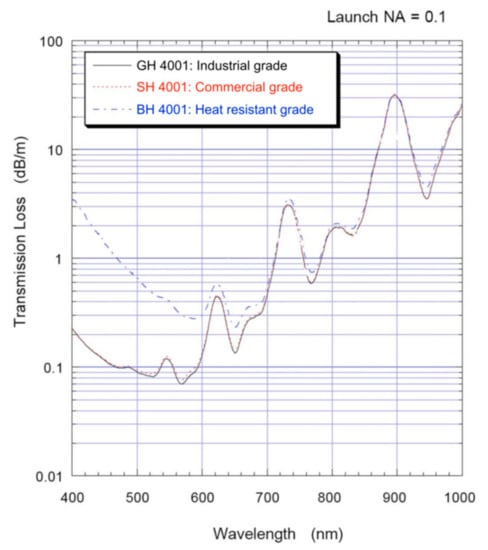 A variety of materials have been used to fabricate POFs, including Polymethyl Methacrylate (PMMA) [57], polystyrene (PS) [58], polydimethylsiloxane (PDMS) [59], cycloolefin polymer (COC) [60], polycarbonate (PC) [61], perfluorinated polymer [62], silicone [63], and cycloolefin copolymer [64]. Different materials of POFs have different characteristics and applications. For example, PMMA has the low loss transmission characteristic in the visible region, which is the most commonly used commercial POF material. Figure 1 shows the typical transmission loss spectra of PMMA-based POFs from ESKATM [65]. Compared with the PMMA-based POFs, PC-based POFs have better heat resistance, which make them suitable to be used in a high-temperature environment. The perfluorinated polymer fibers (CYTOP) possess the feature of low material dispersion, which gives them a larger bandwidth.