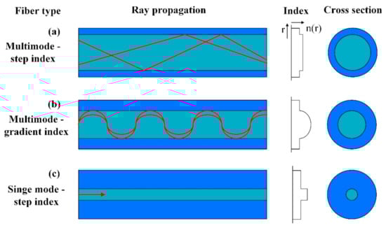 The most common and the first development structure of a POF is the step-index (SI) multimode POF. The schematic illustration of this structure is shown in Figure 2a. It consists of two layers: the core with a large diameter and the cladding with a small thickness. The common core material of this type of POF is PMMA with a larger RI, and the common cladding material of this type of POF is a fluorinated polymer with a lower RI [66]. This type of fiber can transmit a large number of modes, and it has been used in the sensing fields for a long time with the intensity demodulation method generally. Another common structure is the graded-index (GI) multimode POF, as shown in Figure 2b, the core material of this type of POF is often perfluorinated polymer with a graded RI [67]. Compared with the PMMA-based POFs, the GI perfluorinated polymer-based POFs have the low loss transmission characteristic at the communication wavelengths of 850 nm and 1300 nm. The diagram of SI single-mode POF is shown in Figure 2c [68]. This type of POF can propagate only one mode at a fixed wavelength, it has the significance applications in the development of POF-based gratings. Besides, the microstructured POFs including the photonics crystal fiber (PCF) [69] and the multicore fiber [70] have also been developed and proposed for sensing applications.