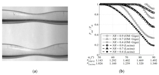 The tapered POF can be fabricated by the heat-drawing method [72,73,74] or the chemical etching method [75,76]. Different heating sources including the furnace [72], the solder gun [52], and the flame [73] were used to heat the POF. Ujihara et al. [74] fabricated a tapered GI perfluorinated POF by a high-power light propagating inside the fiber, an approximately 4 mm long tapered region was obtained, and a RI sensitivity of 107 dB/RIU was achieved by using this fiber probe. In 2008, a tapered graded-index POF was fabricated and proposed for RI measurement by J. Arrue et al. [77]. They employed a ray-tracing method to analyze the behavior of light transmitted in the tapered GI POF and investigated the influence of the narrowing ratio on the RI sensitivity and RI measurable range for the OM-Giga/POF and the Lucina fibers as shown in Figure 4. They found that the narrowing ratio does not need to be very small for a large range of RIs to be measurable, but the maximum RI that can be measured is smaller than the case of the OM-Giga/Giga POF fibers. For the same narrowing ratio, the range of RIs that can be measured with a tapered Lucina POF is greater than that with a GI glass fiber.