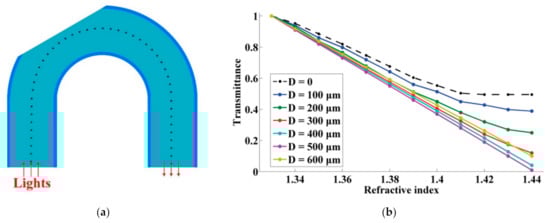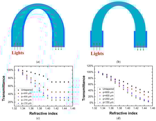 The macro-bending structure was often combined with the taper or side-polished structure to increase the RI sensitivity of sensor. For example, Teng et al. [87] proposed a macro-bending tapered POF for the RI sensing as shown in Figure 8. The RI sensing performance for the probes with and without cladding was investigated. By changing the taper waist and curvature radius, the sensing performance of the probe was optimized. The highest sensitivity of the probe with cladding reached 937%/RIU in the RI range of 1.33–1.41, for the probe without cladding, the RI sensing range expanded to 1.33–1.45, and the sensitivity was about 800%/RIU. The temperature dependence of the probe with cladding was also investigated by the same group [88]. Wandermur et al. [89] manufactured a U-shaped probe with a specially developed device. The RI sensing performances for the probes with different structure parameters were compared. After functionalizing with antibody anti-E. coli serotype O55, the probe was tested with bacterial concentrations of 104, 106, and 108 colony-forming units/mL (CFU/mL), and the decaying parameters of 3.0 × 10−3, 3.6 × 10−3, and 8.0 × 10−3 were obtained, respectively.