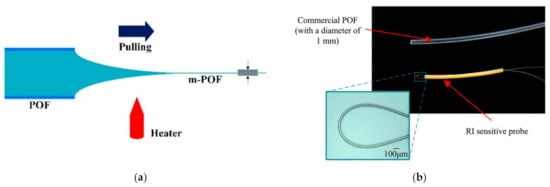 To date, many different kinds of optical fiber-based RI sensors have been proposed. For example, the fiber grating-based sensors including the fiber Bragg gratings [7,8,9], the long-period fiber gratings [10,11,12], and the titled fiber Bragg gratings [13,14,15] were employed for RI sensing; different types of fiber interferometers, such as the Mach–Zehnder interferometer [16,17,18], the Fabry–Pérot interferometer [19], the Michelson interferometer [20], and the Sagnac interferometer [21,22], were used for RI measurement; many kinds of optical fiber-based surface plasmon resonance sensors were proposed for RI sensing [23,24,25]. Besides, some 2D materials like graphene [26] and molybdenum disulfide (MoS2) [27] were also integrated on the fiber for RI measurement. Most of the reported optical fiber RI sensors are based on the glass optical fibers; however, after the structural modification, they will become very fragile, which makes them unsuitable for RI measurement in some special situations. Compared with the glass optical fibers, the polymer optical fibers (POFs) can solve these issues. This kind of fiber is made of polymer materials, which have an ease of fabrication and operation, low cost, high flexibility, softness, and light weight [28,29]. The POF-based sensors have the advantages of high strain limit, ease of operating, and high repeatability, and can be used in harsh environments and bending situations [30,31]. In addition, polymer materials are more easily doped with organic materials [32] and compatible with biological materials, which gives POF-based sensors great potential in the biological sensing fields [33]. To date, the POF-based sensors have many applications including temperature detection [34], liquid level detection [35,36], displacement detection [37], PH detection [38], strain detection [39], bending measurement [40], environment detection [41], and so on.