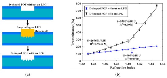 In 2019, Xue et al. [108] fabricated the LPGs on the POFs with different diameters and investigated their RI sensing performances. The results showed that a higher RI sensitivity can be obtained when the LPG structure was imprinted on a thin POF (with a diameter of 0.25 mm), and the optimum sensitivity of 2815%/RIU with a resolution of 1.39 × 10−4 RIU was achieved in the RI range of 1.33–1.45 when the grating period, the groove depth, and the tilted angle were 100 µm, 65 µm, and 20 °, respectively. Later, the same group proposed a D-shaped POF assisted by an LPG structure for RI sensing [109], as shown in Figure 13. The results showed that the LPG structure could achieve an enhanced RI sensitivity. When this structure was fabricated on POF with a thin diameter of 0.25 mm, the high sensitivities of 2676 %/RIU and 9786 %/RIU could be obtained in the RI ranges of 1.33–1.40 and 1.40–1.45, respectively.