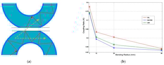 The schematic diagram of the side-polished POF coupler (a), and the variations of K for the probe with different bending radius in different liquids (b) [111].