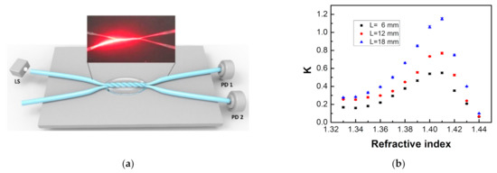 - Teng, C.; Deng, H.; Liu, H.; Yang, H.; Yuan, L.; Zheng, J.; Deng, S. Refractive Index Sensor Based on Twisted Tapered Plastic optical fibers. Photonics 2019, 6, 40. [Google Scholar] [CrossRef] [Green Version]