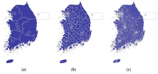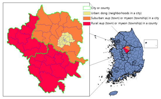 As shown in Figure 1, administrative divisions of South Korea comprise 17 principal-level local governments (special cities, metropolitan cities, and provinces) and 226 municipal-level divisions (cities, districts, and counties). The cities and districts tend to be more urbanized areas and the counties are rural areas. These areas are further divided into a total of 3,498 sub municipal level regions [21]. Areas at the sub municipal level are divided into three types: areas ending in -eup (corresponding to a town) in Korean names, areas ending in -myeon (corresponding to a township), and areas ending in -dong (corresponding to a neighborhood). A dong is the smallest unit administrative division of urban governments such as a city or district; eup and myeon are administrative divisions on the outskirts of the city area excluding dongs or in the county. Therefore, these regions have fewer urban characteristics compared to those of dongs.