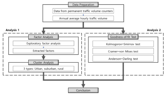 Two theoretical analysis techniques were used to evaluate the adequacy of the proposed method. One method uses the traffic flow characteristics of highways as indicators and performs the regional classification by applying factor and cluster analyses; the results were compared with the classification based on the administrative division system. The other method examined whether the three groups classified by the administrative division system are different groups with differentiated characteristics using a two-sample goodness-of-fit test method. In this method, the traffic flow characteristics of highways were also used for the test. The analysis was performed on the national highways of South Korea. For the data, the traffic volume data collected from 536 permanent traffic volume counting stations in 2019 on the national highways were used to analyze the traffic flow patterns of national highways in each region. Further, an hourly traffic volume ratio to a 24-h traffic volume—an important factor for road safety analysis—was selected among various traffic flow characteristics that can be identified through the traffic volume data.