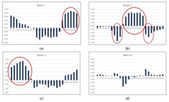 It is possible to determine the variable mainly explained by a factor based on the factor loading values presented in the factor matrix in Table 2. Thus, it is possible to name factors based on their characteristics [42]. To this end, a column chart is prepared as shown in Figure 5 for the easy visualization of the magnitude and sign of factor loading values of each factor. As shown in Figure 5, the column size of the variables explained by the factor appears to be longer (up or down), which makes it easier to identify the characteristics.