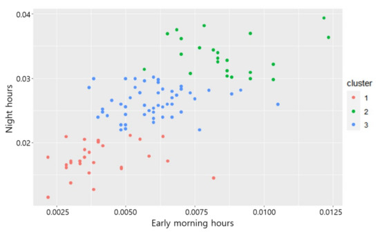 Table 5 summarizes the results of the cluster analysis for each scenario. The values of BetweenSS/TotSS did not show a significant difference based on the four methods; the values were arranged in the ascending order based on the Hartigan–Wong value. The smaller the number of variables used in the analysis, the larger was the BetweenSS/TotSS value. If these values are greater than 0.6, the adequacy of the cluster analysis result is considered to be good. The results of the cluster analysis obtained using 13 out of 15 scenarios indicated that BetweenSS/TotSS ≥ 0.6, which implies the adequacy of the method. Scenario 14, which showed the highest fitness value, used the day off-peak hours as a variable. It can be interpreted that the day off-peak hours suggest the hourly traffic volume ratio characteristic that can be best classified by the three clusters.