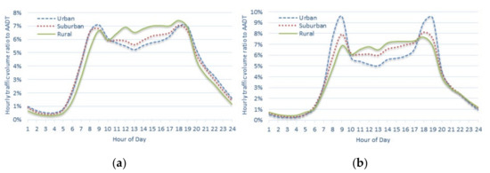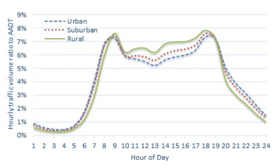 Figure 9 shows the annual average hourly traffic volume ratio to AADT for each type of region presented in Table 7 as a graph. In Figure 9, the difference in the distribution of each region type can be confirmed visually. In the urban area, a two-humped shape observed where a considerable amount of traffic is concentrated during the peak hours of commuting to and from work is dominant, whereas in the rural area, this type of peaks is less pronounced. The suburban area shows an intermediate trend between the urban and rural areas.