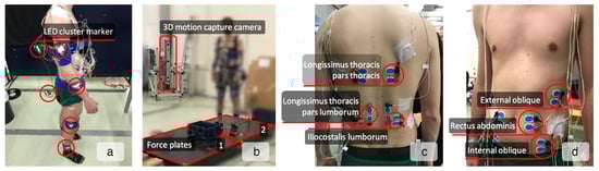 Figure 1c,d). The electrodes were bilaterally placed over rectus abdominis (ventrally at the umbilicus level), internal oblique (superior to the inguinal ligament), external oblique (mid-axillary line, halfway between the iliac crest and the lowest edge of the ribcage), Iliocostalis lumborum (6 cm lateral to L2), longissimus thoracis pars lumborum (3 cm lateral to L1), and pars thoracis (4 cm lateral to T9), as described by [