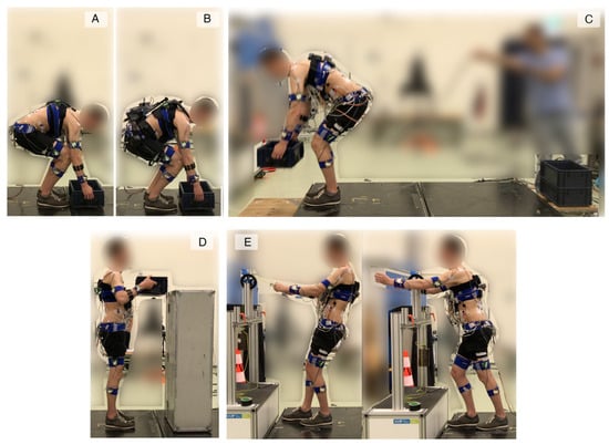 23]. In short, they activated their back and abdominal muscles with a maximum effort. The peak values of the linear envelope of the EMG signals were defined as the MVC for each muscle. Then, they carried out different work-related tasks, namely, (A) lifting from the ground without an exoskeleton, (B) lifting from the ground with an exoskeleton, (C) box stacking, (D) lifting from a shelf, and (E) pulling and pushing (