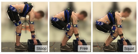 During A, participants lifted a box from the ground to the upright posture, followed by placing it back on the ground. Data obtained from these lifts were used for the calibration as explained in the next section and will be referred to as calibration trials. These lifts were performed in 14 (2 × 2 × 2 + 2 × 1 × 3) conditions with different lifting characteristics, i.e., mass lifted (7.5 and 15 kg), lifting technique (stoop (keeping knees extended and reaching the box with trunk flexion) and squat (keeping trunk extended and reaching the box with knee flexion),