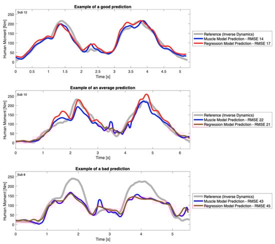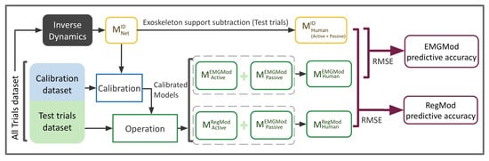 14]. Third, the calibrated EMGMod and RegMod were applied on the test trials to predict the active moment, i.e.,