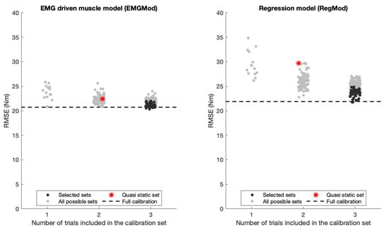The results suggest that for EMGMod, using one calibration trial may suffice to adjust the subject-specific parameters. This may be because, unlike the RegMod, the EMGMod is established based on biomechanical principles of the musculoskeletal system and the calibration is required for adjusting subject-specific parameters of the model. Consequently, very few calibration trials may provide enough information to approach the maximal accuracy. However, calibration through three trials based on the Selected Sets would provide more robust accuracy.