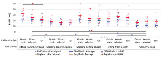 p = 0.01) was found for EMGMod. Pairwise comparison Bonferroni tests showed that RMSEs for pulling/pushing tasks were lower than those for lifting from the ground (
