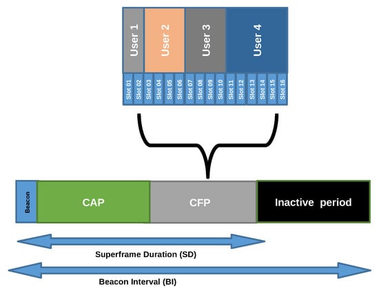In a star topology, the users are ruled by a centralized AP node, called Coordinator. The synchronization of the network nodes is possible by a superframe (SF) structure allowing communication with the network elements. The IEEE 802.15.7 superframe structure, which is shown in Figure 1, is divided into active and inactive periods. The nodes communicate during the active period and remain in sleep mode during the inactive period. The active interval is further divided into two parts, Contention Access Period (CAP) and Contention Free Period (CFP). The superframe begins when the coordinator transmits a beacon frame to synchronize the users. If a user loses this beacon frame, he can not perform any action until a new beacon is received. Furthermore, the node with a long unsynchronized time needs to join to new APs. The duration of the superframe is known as Beacon Interval (BI) which depends on the optical clock (OC) frequency, the number of slots per frame, the Beacon Order (BO), and the number of the optical clock in the aBaseSlotDuration usually equal to 60 OC [22]. Equation (1) defines the time duration for BI