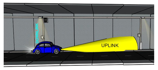 - Torres-Zapata, E.; Guerra, V.; Rabadan, J.; Perez-Jimenez, R.; Luna-Rivera, J.M. Vehicular Communications in Tunnels using VLC. In Proceedings of the 2019 15th International Conference on Telecommunications (ConTEL), Graz, Austria, 3–5 July 2019; pp. 1–6. [Google Scholar] [CrossRef]