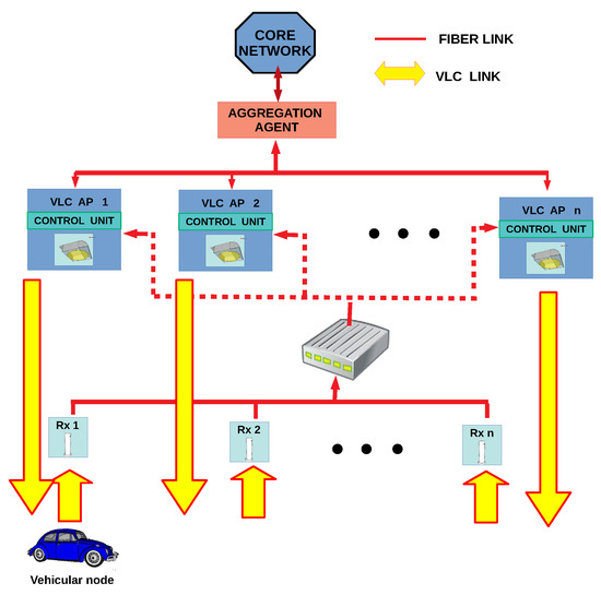 Due to the AP’s receiver location, the uplink’s power signal increases gradually. But suddenly, it suffers a drastic power reduction. Under this situation, an untimely handover initialization can break the uplink easily. So, it is necessary to increase the redundancy in this link to avoid abrupt interruption in the communication. As a partial solution, a new topology was presented in [57]. The topology extends the uplink range by integrating all the infrastructure’s receivers in a new sublayer named “2.5”. For this case, the receivers work as standalone devices connected by fiber to a common switch, which acts as an intermediary between receivers and the APs. Each receiver performs the optical signal demodulation and decodification to recover the binary information. Then, they send the information to the switch which checks the OWPAN-ID address to know the destination and redirect it. Finally, the AP receives the frame information and manages the channel access and other processes in the communication. This topology aims to extend the uplink range by increasing the time to resolve a handover. It allows the AP to receive a VLC frame when the vehicular node has passed its nearest receiver. It is because the switch redirects the frame using its header information allowing the collection of frames from any receiver. There are some cases when two or more receivers can receive successfully the same frame. If this situation happens, the switch will eliminate the redundant frames of the network. It allows the system to operate when a handover has not been initialized opportunely without disrupting the service. Figure 5 displays the diagram of this 2.5 layer topology.