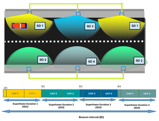 Another system design consideration is the distribution of the cells. In the IEEE 802.15.7 standard, there is a superframe configuration to support the user’s mobility. In this configuration, multiple cells work coordinately transmitting the beacon at the same time and using a common CAP. The CFP is assigned per cell sequentially to avoid interruptions. In contrast, in our proposed system design, each site uses the superframe configuration for a single site. BI is 2 ms long and four times SD with a Beacon Order of 7 and SuperOrder of 5. Thus, each AP is active just a quarter of the time. The rest of the time is used in turns by neighbors APs. So, the SD shifts on the time to work as Time Division Multiple Access (TDMA), see Figure 6. These actions allow coexistence between contiguous APs and the user, reducing the system throughput as commented before.