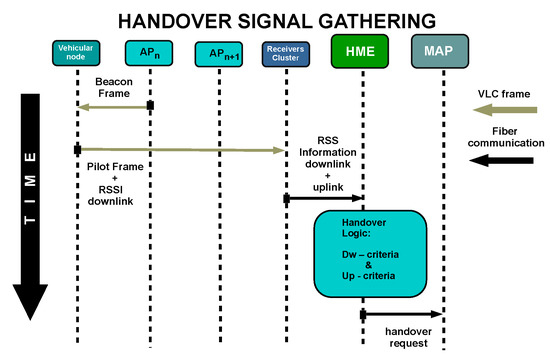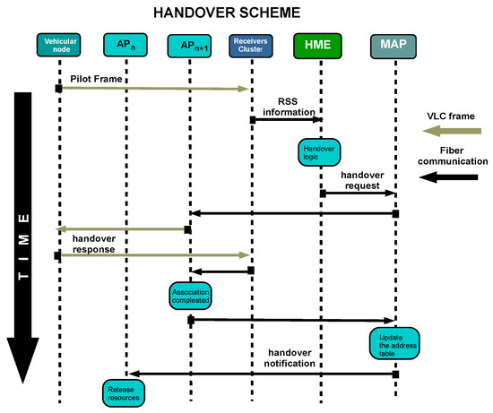 The last stage is the handover execution stage when the vehicle node switches over from its current AP to the next one. As mentioned before, the handover execution is based on HMIPv6. Figure 9 shows the execution scheme. After the gathering process stage, HME sends a handover request to MAP which checks if has enough resources to receive an additional user. The request is delivered to that tries to establish direct communication with the vehicular node. So, it emits the petition using the VLC channel. If the user can reply successfully, the handover completes its process, and reports it to MAP. Finally, the receives a notification that the user does not belong anymore to the network.