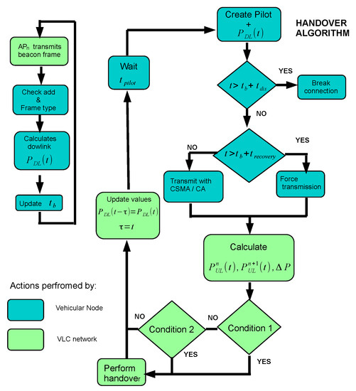 Previous research works on VLC for vehicular communications have mainly focused on the physical layer aspects of point-to-point communication. Few studies have been done to explore the higher layers issues when deploying a vehicular VLC network. For instance, in V2I cases, the network restructures rapidly, preventing users from staying connected to an AP for more than a few seconds. As consequence, the vehicle reduces its available connection time. This barrier has produced a growing interest in studying handover mechanisms for continuous communication in the vehicular network. The user could tackle this problem by holding the session while moving through the different Road-Side Units (RSUs). The handover process requires the coordination of the APs in the area with upper-layer entities. The handover is a set of steps to detect in advance when the user’s node is on the coverage area bounds. Then, it informs the next AP to prepare resources before the communication link breaks. Depending on the movement of the vehicular node, it can move to a neighbor VLC AP (horizontal scheme) or migrate to another communication technology (vertical handover). The implementation of handover schemes for VLC is still at a very early stage, with only a few works within this open area of research [20,21]. Section 2 provides a more detailed analysis of this problem.