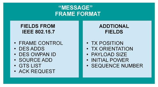Despite OMNet++ helping to simulate the most common communication protocols such as INET, nowadays, there is not an open-source OMNet++ framework for VLC systems. For this reason, we needed to develop our component-based simulation libraries for the VLC framework in OMNet++. Figure 10 displays the simulation organization for the developed VLC network. It consists of three main modules: vehicular node, infrastructure module, and network controller module. Each module is composed of several subprograms to provide the signal propagation properties and the multiple logical processes. At the same time, the vehicular node and infrastructure module exchange information using a “message” object with the most relevant fields of the frame format defined in the IEEE 802.15.7 standard. Thus, we have also developed a special object-oriented program called “Message” that symbolizes the frame transmission and permits interaction between these components. Figure 11 shows the “message” frame format used in the simulations. Additionally, this message has extra information for providing more realistic simulations.
