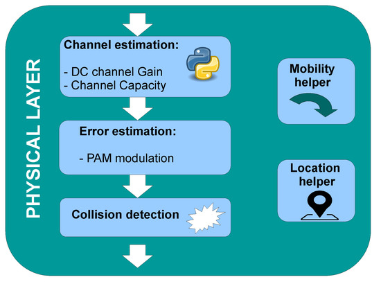 A system-level simulation tool provides a common way to validate new handover schemes. Due to the relative novelty of VLC, there are not many software libraries of this technology for this kind of simulator. While some research groups have created some ns3-based modules to evaluate VLC links [48,49], none of them provide official support. However, these modules mostly consider only the link physical layer properties ignoring protocols from the link and upper layers. Some additional research works include evaluations of the multiple access scheme on the standard IEEE 802.15.7 under diverse conditions without evaluating the VLC link [50,51,52].