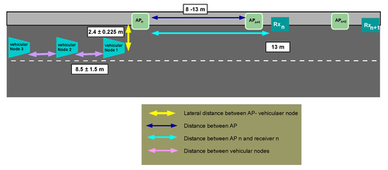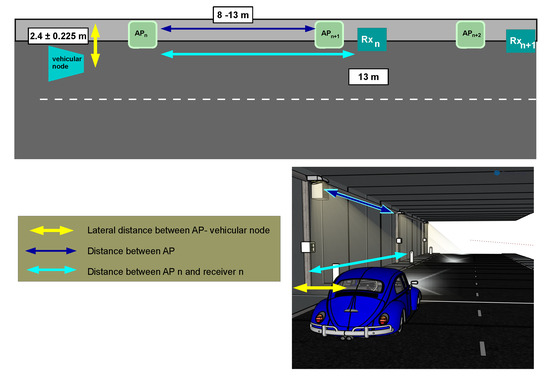 The network communication layout comprises a group of APs built-in the illumination system along the entire tunnel, which acts as RSUs. Each vehicular node has a VLC module that uses the headlamps as a transmitter and a photodiode-based receiver on the vehicle’s hood. A full-duplex VLC system is assumed between a vehicular node and the APs. Figure 4 depicts the deployed vehicular VLC network scenario in which the tunnel roadside infrastructure provides coverage for the vehicular nodes. The AP’s receiver is at 13 meters (m) forward its transmitter and a half meter from the ground level. This receiver’s position is determined based on our previous analysis presented in [55,56], where the channel propagation is studied for both uplink and downlink. The results show that the AP benefits to separate RX from the rest of its hardware to get a LOS contribution from the vehicular node.