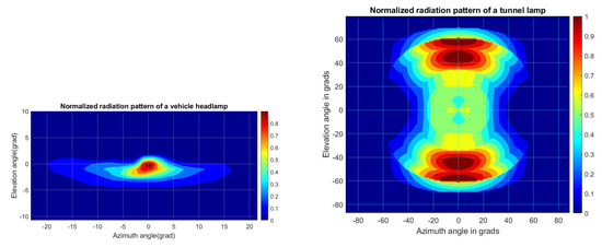 The PHY layer submodule evaluates the VLC link status and channel properties to determine when it is physically possible to receive a frame. The same PHY layer submodule is implemented both in the vehicular node and the AP node. Figure 12 shows the internal organization of the PHY layer block. It only takes care of the signal transmission, so it processes all incoming frames without segregating or ignoring them by their header information (OWPAN ID or destination address). First, the transmitter puts a stamp in the “message” frame with its spatial information. When any node receives this “message” it calculates the channel impact on the transmission using MMC with 50,000 random rays and 3 rebounds each. MMC is done considering the specific radiation pattern of both light sources (tunnel streetlights and vehicle headlights), they are shown in Figure 12. Both patterns differ from the typical Lambertian profile and were modeled using the technical information of tunnel streetlamps and experimental measurements from a car headlight. Additionally, the reflection coefficient from concrete and asphalt were considered with a value of 0.17 and 0.07 respectively [59].