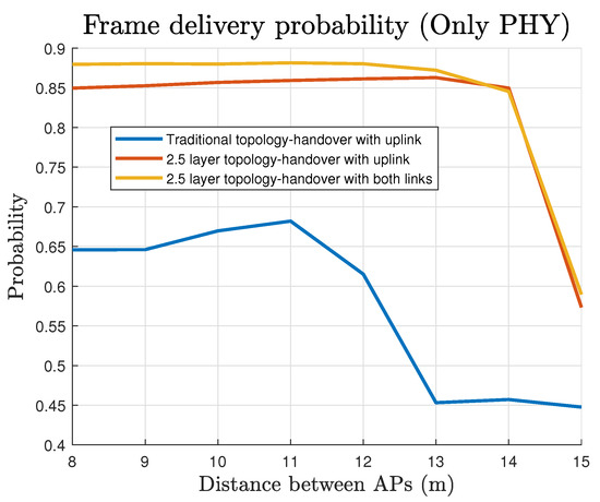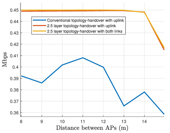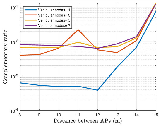 From Figure 21, it is evident how the service availability decreases with the number of vehicular nodes. For this scenario, the service time is affected because multiple vehicles join the same AP. Therefore, the AP does not transmit any information to a new vehicle until the previous frames in the buffer of the AP have been delivered. Thus, the service is more likely to be interrupted during the handovers. As expected, the results depicted in Figure 21 corroborate how the service time is reduced on average. Moreover, the operation of multiple vehicles in a close area makes the blackout time increase up to 20 ms when the AP separation distance is less than 13 m. Furthermore, when the separation of the APs is shorter, the handover occurs much more frequently.