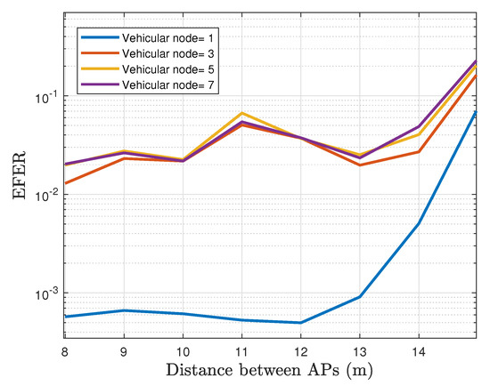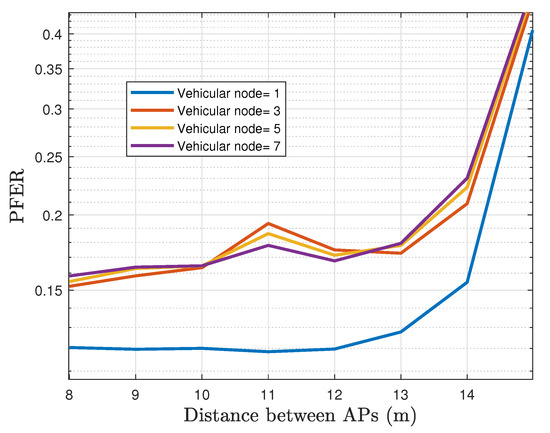 Figure 22 plots the comparison of the EFER for a different number of vehicular nodes. The results exhibit a considerable drawback when more than one user is associated with an AP. We observe that the EFER converges to at distances under 13 m, which is a substantial rise in comparison with from the single-vehicle scenario. On the other hand, Figure 23 shows that the PFER performance has a similar tendency to EFER. As expected, a single-vehicle crossing the tunnel achieves superior performance with an error rate of 12% when the distances between lamps are less than 12 m, which is regulatory. However, PFER does not exceed a maximum value of 19% regardless of the number of vehicles in the same scenario. Indeed, the PFER performance value for three or more vehicles does not change notably.
