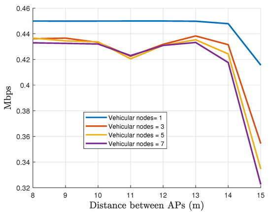 Finally, Figure 24 depicts the measured data rate with respect to the separation of the AP and the number of active vehicular nodes. Here, the data rate is reduced to 420 Kbps with m = 3, 5, and 7 vehicular nodes in the network. More interesting, it is worth noting how quickly the data rate of convergence is obtained when the separation between APs is under 14 m. It means that the solution is scalable without significant penalties.