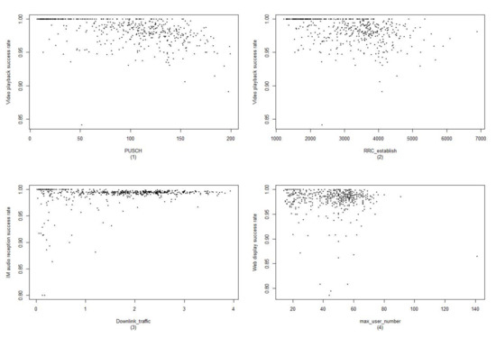 In Figure 2: (1) shows the corresponding relationship between the video playback success rate (KQI) and the PUSCH utilization rate (KPI) in the cell; (2) shows the corresponding relationship between the video playback success rate and the number of RRCs established in the cell; (3) shows the corresponding relationship between the IM audio receiving success rate and the downlink traffic in the cell; (4) is the corresponding relationship between the web display success rate and the max number of the cell.