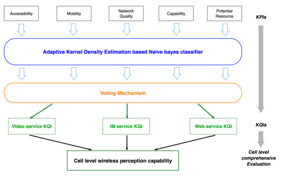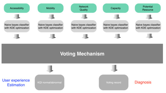 Considering the complexity of KPI data in wireless networks, we also used KDE to estimate user experience. In this way, accuracy is guaranteed, and the discretization operation is not needed in the prepossessing part. We propose an adaptive bandwidth selection method for KDE. It can be seen that the estimation of user experience is mainly concentrated in a certain service [10,12,13,15]. In this paper, we propose a cell-level wireless network perception capability, and we chose three main service types in the analysis of user experience. These three types of services are web browsing, instant messaging, and video services. At the same time, it can be seen from the current research that most of the user experience estimation does not consider the combination of fault diagnosis and estimation. In this paper, we introduced a voting mechanism to bring fault diagnosis into the research of user experience. In this way, user experience can be monitored in real time. When the degradation of user experience is estimated, the fault causes can be found out in time and network optimization can be carried out. For the estimation algorithm based on naive Bayes, KDE with an adaptive bandwidth was used to improve the prediction accuracy and further improve the efficiency of network management and optimization.