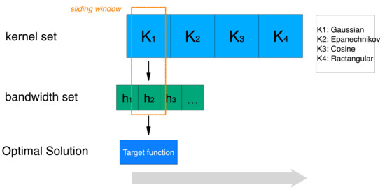 In order to select the optimal kernel function and bandwidth, we propose a two-step optimization scheme. As shown in Figure 4, the kernel function and bandwidth were successively selected through a sliding window. Specifically, we first selected one of four kernel functions, then found the optimal bandwidth based on the known kernel function. When the optimal bandwidth of each kernel function was selected, we chose the optimal kernel density estimation scheme from these four cases and used it in the classifier. The specific algorithm is given by Algorithm 1.
