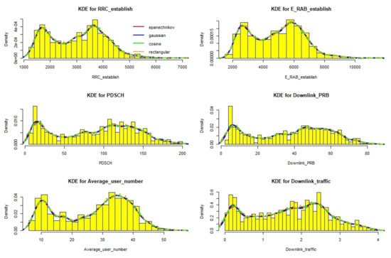 In Equation (3), is a kernel function. is a smoothing parameter called the bandwidth. represents n sample points. In the kernel density estimation part, we selected the kernel function and the optimal bandwidth, respectively. Considering the different data distribution for each KPI, four kernel functions were used for simulation, and they are Gaussian, Epanechnikov, cosine, and rectangular.