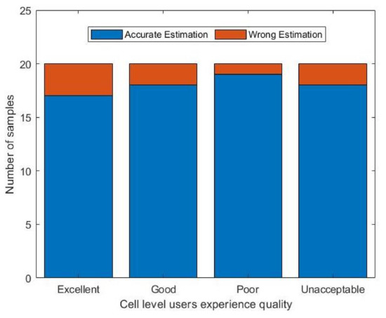 Cell-level wireless network perception is an overall evaluation index of users for three service types in a cell. The evaluation criteria are shown in Table 4. There are four levels of perception, namely excellent, good, poor, and unacceptable. In the verification process, we selected 80 groups of data, and each level contained 20 groups of data. For the estimation, we combined the voting mechanism with the two-step-optimized AKNB to obtain the estimated KQI for the three services, then the KQIs for three services were summarized into cell-level wireless network perception capability. The statistical results are shown in Figure 9 and Table 7. The proposed method can well estimate the perception capability of cell-level wireless networks.