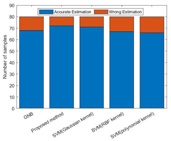 At the same time, commonly used algorithms in the research of user experience were also selected to evaluate the perception ability of cell-level wireless networks, and the application performance of various algorithms in such scenarios were verified. As the verification in previous step, we used 80 sets of data for the different algorithms. The difference was that we only counted the number of correctly estimated and incorrectly estimated samples, not for different levels of user experience. In our proposed scheme, adaptive kernel density estimation and naive Bayes were used to estimate users’ experience for each type of KPI, and the final user experience was obtained by the voting mechanism; for other algorithms, all KPI data were used to estimate the user experience. These different algorithms were used to estimate the user experience of the three services, respectively, and the estimation results of the three services were summarized as the cell-level wireless network perception capability. Figure 10 shows the results. The proposed algorithm and the SVM based on the Gaussian kernel function had better performance. The algorithms that performed well in user experience prediction can be used to evaluate the perception ability of cell-level wireless networks.