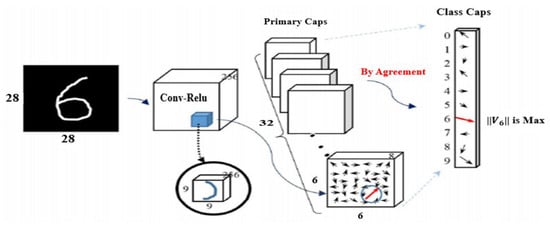As shown in Figure 1, the CNB architecture includes a feature extraction layer using convolutions and a primary module composed of several capsule layers followed by a classification (digit) layer. The information held in the primary capsule block is given to the classification (digit) layer, which uses a dynamic routing method stated above, and this method is called routing by agreement. Furthermore, the coupling coefficients among the capsules in the primary and classification (digit) capsule layers are renovated to increase the classification performance. The output of the classification capsule layer is a class capsule of classes, and the norm of every class indicates the foretelling capability for every class.