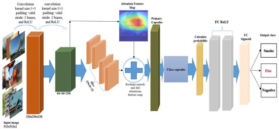 CapsNet has been recommended as a powerful functional extraction technology and robust model structure. As a result, traditional computer vision methods are being replaced by deep learning methods. Our proposed method adopts models that classify smoke and fire in an image/video. An incorrect categorization of images or videos increases the incorrect fire alarm rate owing to changes in the perspective deformations, shadow, and brightness. We detected a template that uses fire and smoke, showing images based on an attentional feature map using CapsNet to learn and extract the powerful attributes of the frame.